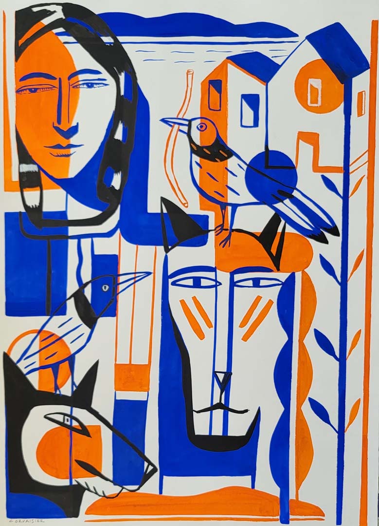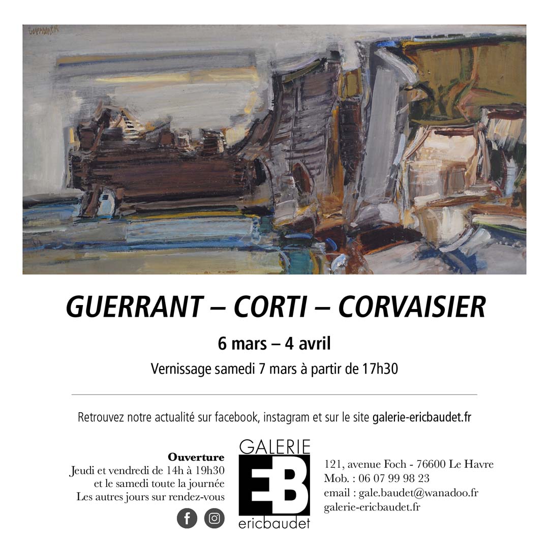 Trois artistes, trois styles. Guerrant l’homme du Pays de Caux et de ses falaises, l’un de ses sujets de prédilection. Etretat, Yport, les Petites Dalles… sont peintes comme il les voit et non tout à fait comme elles sont. Corti et ses muses, sensuellement sublimées dans un jeu de rouge, de vert ou de sable…son art de la composition se révèle aussi, clin d’œil au cubisme, dans les natures mortes. Enfin Corvaisier, peintre, illustrateur vous emmène dans son univers à la fois poétique, tendre et empreint d’humanité, exprimé dans une partition colorée.